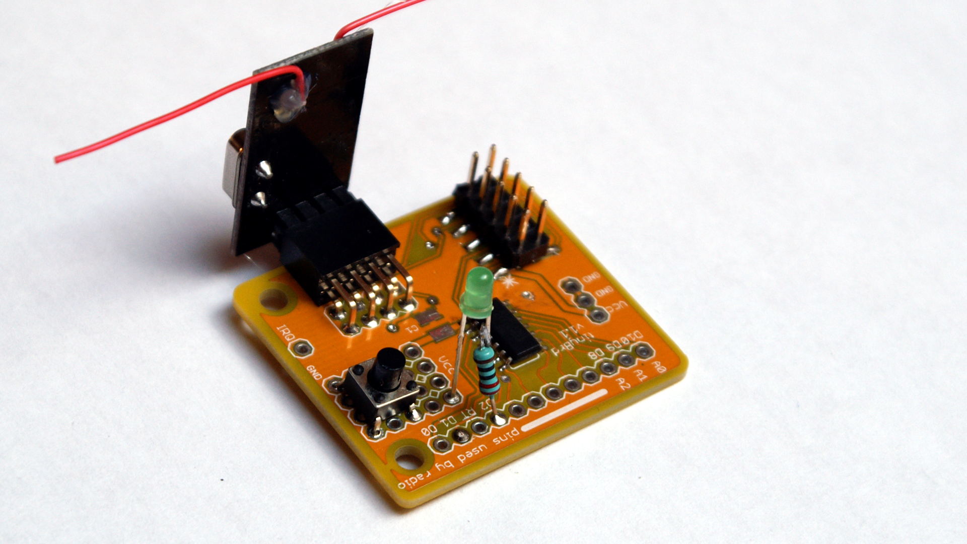 Mając zlutowane elementy, jedno wejście przeznaczamy na odczyt przycisku a jedno na świecenie diodą. Ponieważ (jak widać na zdjęciu) nasz przycisk zasłania całą stronę gdzie jest masa (GND), więc diode podłaczyliśmy trochę inaczej niż zwykle. Zamiast do GND podłaczona jest do Vcc, a do pinu cyfrowego z drugiej strony. Przy zachowaniu właściwej polaryzcji diody, by ją zaświecić, na wyjściu cyfrowym musi pojawić się zero. Wówczas, jest różnica napięć między Vcc a wyjściem cyfrowym i dioda świeci. Gdy na wyjściu cyfrowym jest logiczna jedynka, wówczas napięcie jest bliskie Vcc. Nie ma różnicy potencjałów i dioda nie świeci.